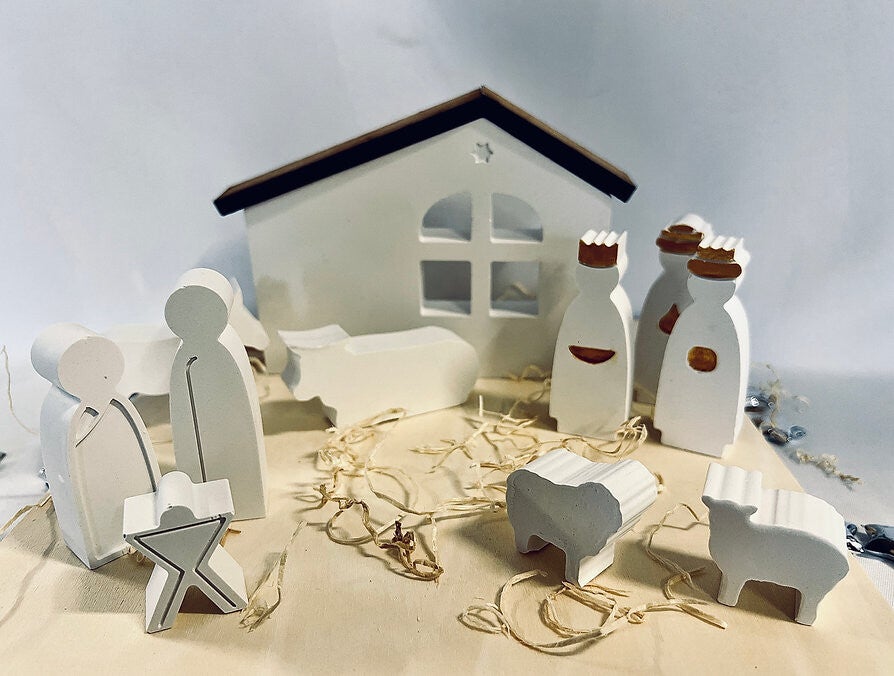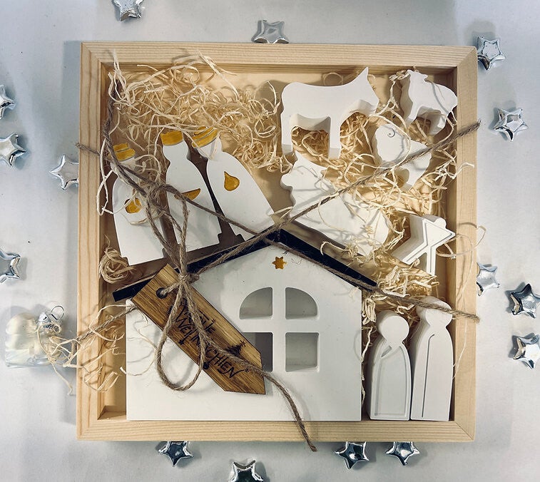 Krippen-Set aus Gießmasse: Handgefertigtes Design mit weißen Figuren und schönen Details. Enthält Maria, Josef, das Jesuskind, die Heiligen Drei Könige, Tiere und eine stabile Krippe. Perfekt für eine stilvolle Weihnachtsdekoration. Lieferung in einer dekorativen Holzkiste mit Naturfüllmaterial.