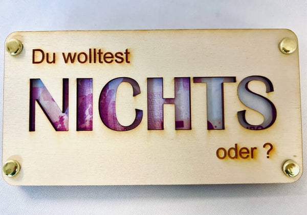 Diese originelle Holzhülle hat eine Größe von 14,5x7,5 cm und kann mit einem Geldschein befüllt werden.
