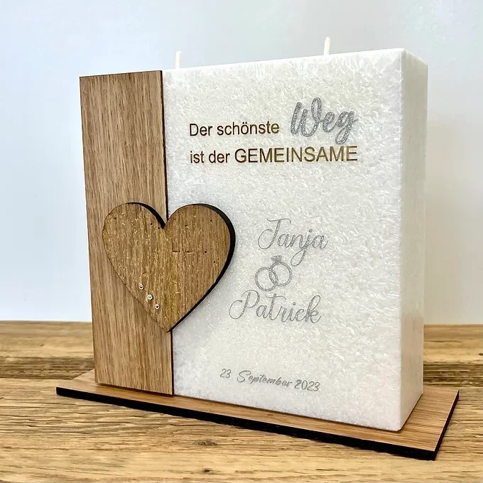 Unsere handgemachte Hochzeitskerze ist mit Liebe zum Detail gefertigt. Mit ihren 20x20 cm ist sie der perfekte Blickfang für Ihre Hochzeit und symbolisiert das natürliche, starke Fundament Ihrer Liebe. Ein unvergessliches Erinnerungsstück, das den besonderen Tag noch schöner macht.
