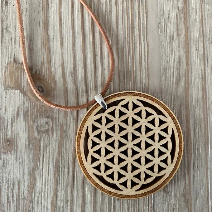 Entdecken Sie unsere wunderschöne Halskette aus Zirbenholz mit der symbolischen Lebensblume, versehen mit einem eleganten Silber-Verbinder und einem Lederband. Dieses zeitlose Schmuckstück steht für Wachstum, Harmonie und die Verbundenheit allen Lebens. Perfekt, um Ihrem Outfit eine besondere Bedeutung zu verleihen oder als Geschenk für einen lieben Menschen. Ein wunderschöner Begleiter für jeden Tag!